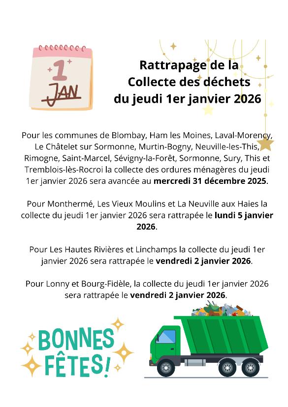 Mercredi : collecte des Ordures Ménagères. Jeudi : collecte des sacs de Tri. Veuillez sortir les poubelles la veille au soir.